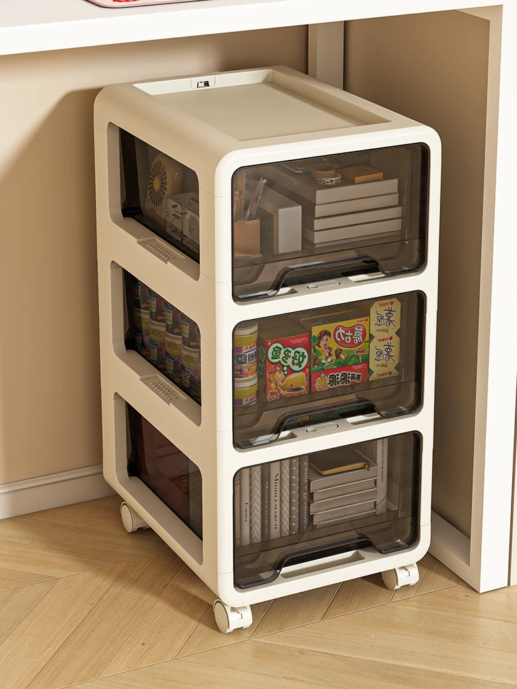 移動可能な本棚兼デスク下の収納ラック!お子様のおもちゃやおやつをすっきり整理できる引き出し付き収納キャビネット。家族全員に優しい、シンプルでおしゃれなデザイン!